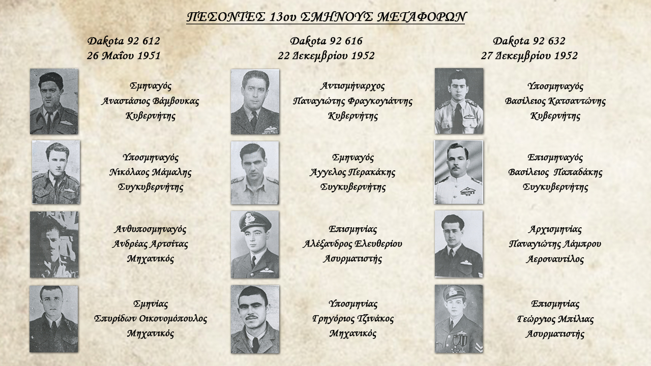 Πρόκειται για 24 βετεράνους του 13ου σμήνους μεταφορών από τους 64 που συμμετείχαν με 7 αεροσκάφη Ντακότα στον πόλεμο της Κορέας. Κατά τη διάρκεια του πολέμου καταρρίφθηκαν 4 αεροσκάφη και έχασαν τη ζωή τους 12 στελέχη της Πολεμικής Αεροπορίας.
