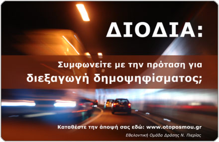 Δημοτικές και κοινοτικές αρχές, προκειμένου να λάβουν απόφαση για σοβαρά θέματα που ανήκουν στη σφαίρα των αρμοδιοτήτων τους, μπορούν να διεξάγουν τοπικό δημοψήφισμα (Νόμος 3852/2010 Νέα Αρχιτεκτονική της Αυτοδιοίκησης και της Αποκεντρωμένης Διοίκησης – Πρόγραμμα Καλλικράτης ). Ψηφίστε στη διπλανή στήλη "Η άποψή σας" http://www.anasta.de/TOPOS/index.php?option=com_content&task=view&id=505&Itemid=1 Το θέμα το διοδίων είναι σοβαρό! Πολλοί από τους βουλευτές, οι οποίοι ψήφισαν το νόμο με τον οποίο παραχωρήθηκαν οι Εθνικοί μας δρόμοι σε ιδιώτες, παραδέχτηκαν εκ των υστέρων, πως δεν γνώριζαν τι ψήφιζαν! Ακόμη και σήμερα, πολλά κομμάτια αυτής της δαιδαλώδους σύμβασης παραχώρησης –τα ειδικά παραρτήματα- δεν κατάφερε να τα διαβάσει κανείς! Γιατί άραγε; Το θέμα το διοδίων αφορά την οικονομία του τόπου μας και πρόκειται να επηρεάσει αρνητικά τις τοπικές κοινωνίες (και όχι μόνο) για τα επόμενα 30 χρόνια, δηλαδή όσο θα διαρκέσουν οι συμβάσεις παραχώρησης. Ένα εθνικό αγαθό υψίστης σημασίας έχει μεταφερθεί σε χέρια ιδιωτών χωρίς να ενημερωθούν οι πολίτες, οι οποίοι μέρα με τη μέρα και για τα επόμενα 30 χρόνια, θα πρέπει να πληρώνουν το χαράτσι των διοδίων. Το πρόγραμμα Καλλικράτης μας δίνει το δικαίωμα να αποφασίσουμε εμείς για το μέλλον μας. Η Εθελοντική Ομάδα Δράσης Ν. Πιερίας προτείνει τη διεξαγωγή δημοψηφίσματος και σας παρακαλεί να καταθέσετε κι εσείς την άποψή σας, λαμβάνοντας μέρος στην ανοικτή διαδικτυακή ψηφοφορία απαντώντας στο παρακάτω ρώτημα: Συμφωνείτε με την πρόταση για διεξαγωγή τοπικού δημοψηφίσματος σχετικά με το θέμα των διοδίων; Ανάλογα με τα αποτελέσματα της ψηφοφορίας, στο επόμενο βήμα, αν η απάντηση στο παραπάνω ερώτημα είναι θετική, θα προχωρήσουμε στη διατύπωση του ερωτήματος που θα τεθεί στο δημοψήφισμα. Η ψηφοφορία ξεκίνησε σήμερα θα ολοκληρωθεί την Κυριακή 5 Δεκεμβρίου 2010. Σας παρακαλούμε θερμά να καταθέσετε κι εσείς την άποψή σας στη διπλανή στήλη "Η άποψή σας". Σας ευχαριστούμε πολύ Φιλικούς χαιρετισμούς από την Κατερίνη Εθελοντική Ομάδα Δράσης Ν. Πιερίας |