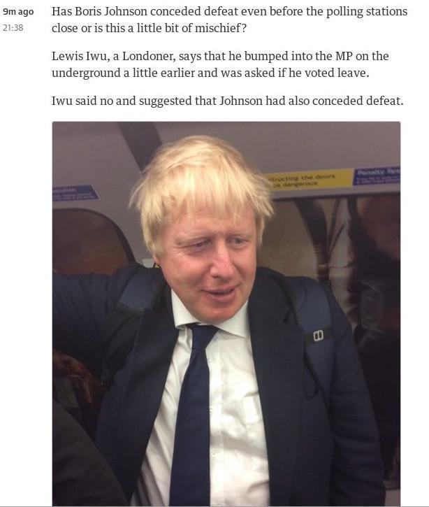 Σύμφωνα με τον ισχυρισμό πολίτη του Λονδίνου, ο υπέρμαχος της εκστρατείας του Brexit Μπόρις Τζόνσον, παραδέχθηκε την ήττα του. Οπως υποστήριξε ο Λούις Ιβου, συνάντησε τον πρώην δήμαρχου του Λονδίνου στο μετρό. Ο υπέρμαχος του Brexit τον ρώτησε αν ψήφισε να φύγει η Βρετανία από την ΕΕ. Οταν ο Λούις απάντησε αρνητικά, ο Τζόνσον παραδέχθηκε την ήττα του.