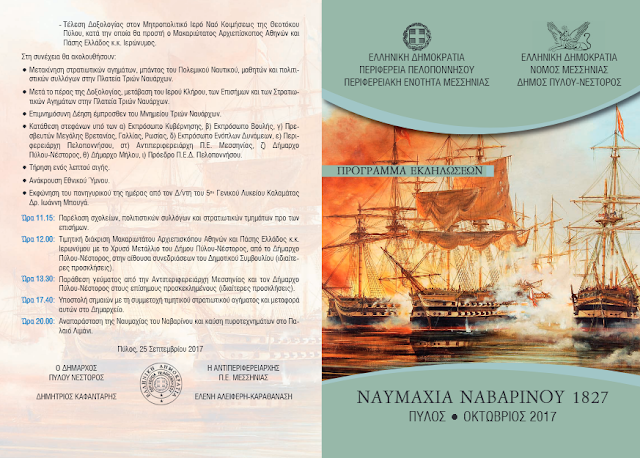 Με ιδιαίτερη χαρά σας προσκαλούμε στις επετειακές εκδηλώσεις της ιστορικής Ναυμαχίας του Ναβαρίνου, που θα πραγματοποιηθούν στις 19 και 20 Οκτωβρίου 2017 ημέρες Πέμπτη και Παρασκευή, στην Πύλο...