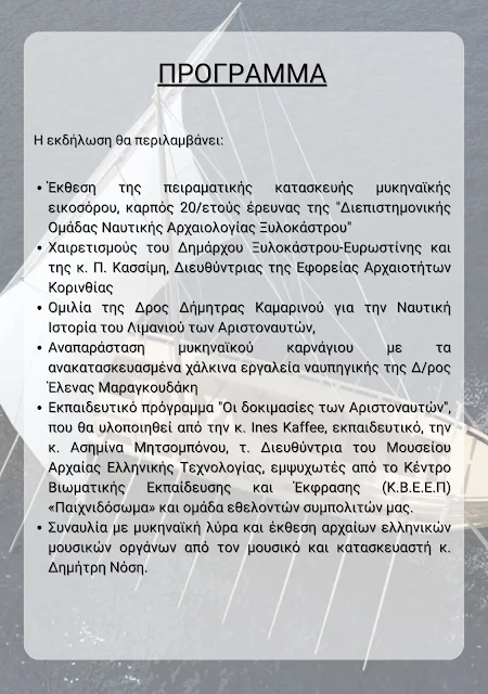Μια έκθεση της πειραματικής κατασκευής μυκηναϊκής εικοσόρου, αναπαράσταση μυκηναϊκού καρνάγιου με τα ανακατασκευασμένα εργαλεία ναυπηγικής και εκπαιδευτικό πρόγραμμα "Οι δοκιμασίες των Αριστοναυτών".